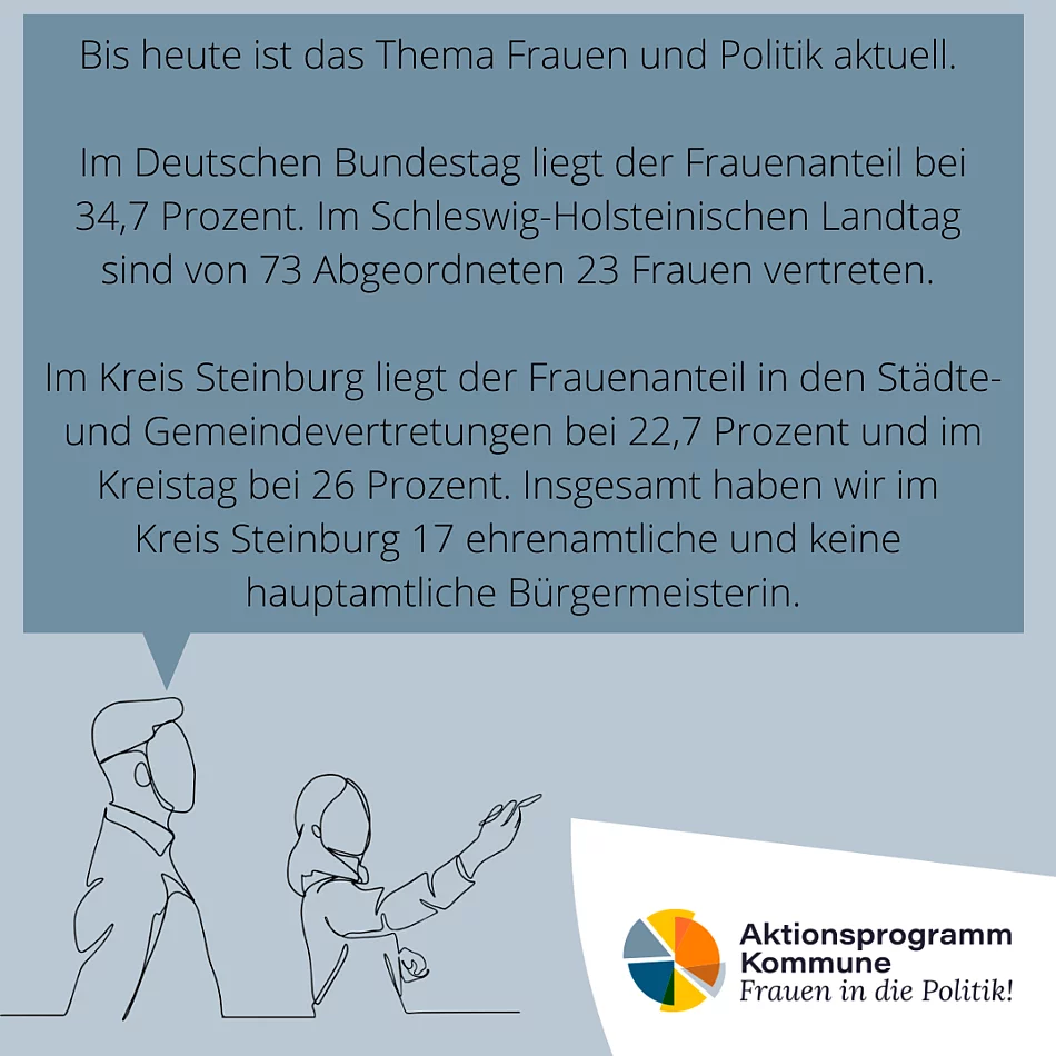 Bis heute ist das Thema Frauen und Politik aktuell. Im Deutschen Bundestag liegt der Frauenanteil bei 34,7 Prozent. Im Schleswig-Holsteinischen Landtag sind von 73 Abgeordneten 23 Frauen vertreten. Im Kreis Steinburg liegt der Frauenanteil in den Städte-und Gemeindevertretungen bei 22,7 Prozent und im Kreistag bei 26 Prozent. Insgesamt haben wir im Kreis Steinburg 17 ehrenamtliche und keine hauptamtliche Bürgermeisterin.