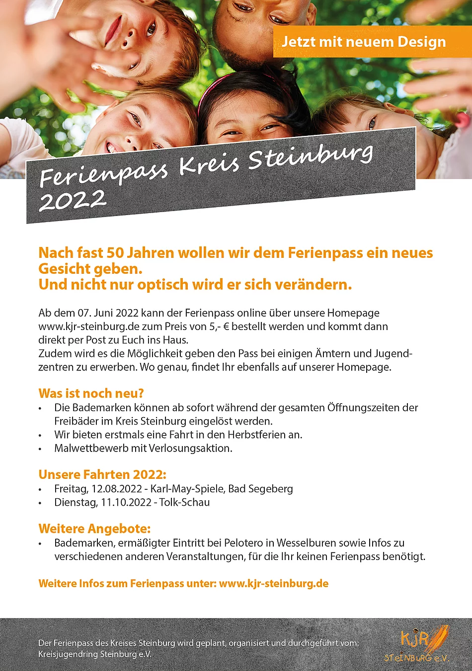 Der Kreisjugendring Steinburg e.V. freut sich sehr, dass nach 2 Jahren pandemiebedingter Pause der Ferienpass des Kreises Steinburg in diesem Jahr mit vielen Neuerungen wieder starten kann. Nicht nur das Layout des Passes hat sich verändert, auch der Verkauf des Passes wird zukünftig nicht mehr über die Ämter abgewickelt. Ab dem 7. Juni wird über die Homepage des KJR Steinburg e.V. der Link zum Online-Verkauf des Passes freigeschaltet, die sich bereits im letzten Jahr beim Steinburger Feriendorf bewährt hat. Der Pass wird dann direkt per Post verschickt und kostet inklusive Porto 5,- €. Etwas zeitversetzt startet später auch die Online-Anmeldung für die geplanten Fahrten.