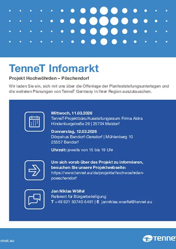 Bekanntmachung Nr. 35/2026 des Amtes Itzehoe-Land für die Gemeinden Drage, Kaaks und Mehlbek - TenneT Infomarkt - Projekt Hochwöhrden - Pöschendorf