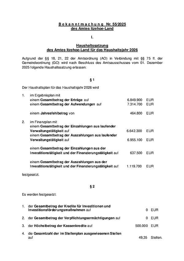 Bekanntmachung Nr. 55/2025 des Amtes Itzehoe-Land - Haushaltssatzung 2026