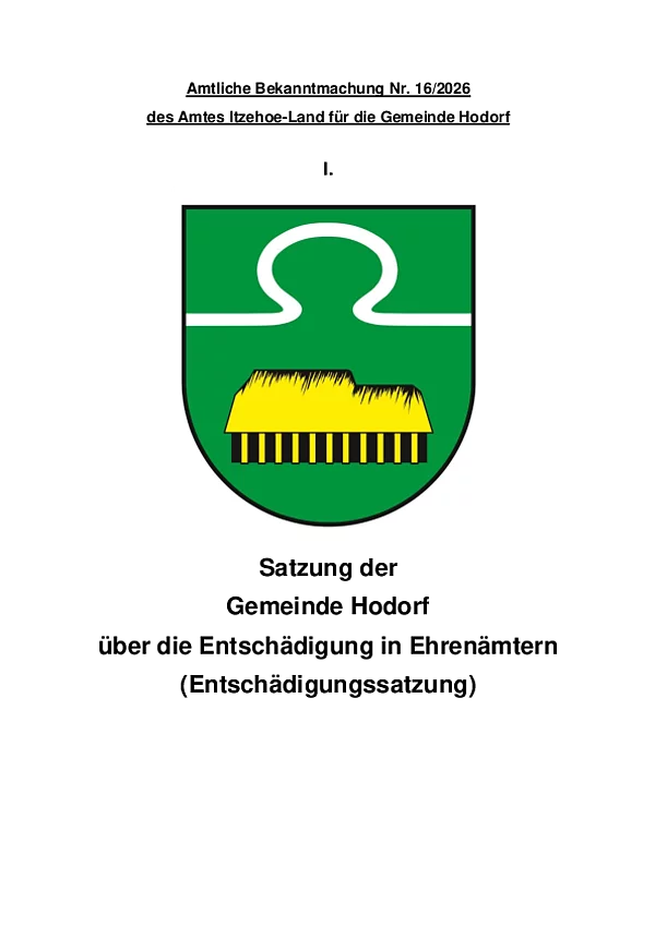 Bekanntmachung Nr. 16/2026 des Amtes Itzehoe-Land für die Gemeinde Hodorf - Entschädigungssatzung in Ehrenämtern